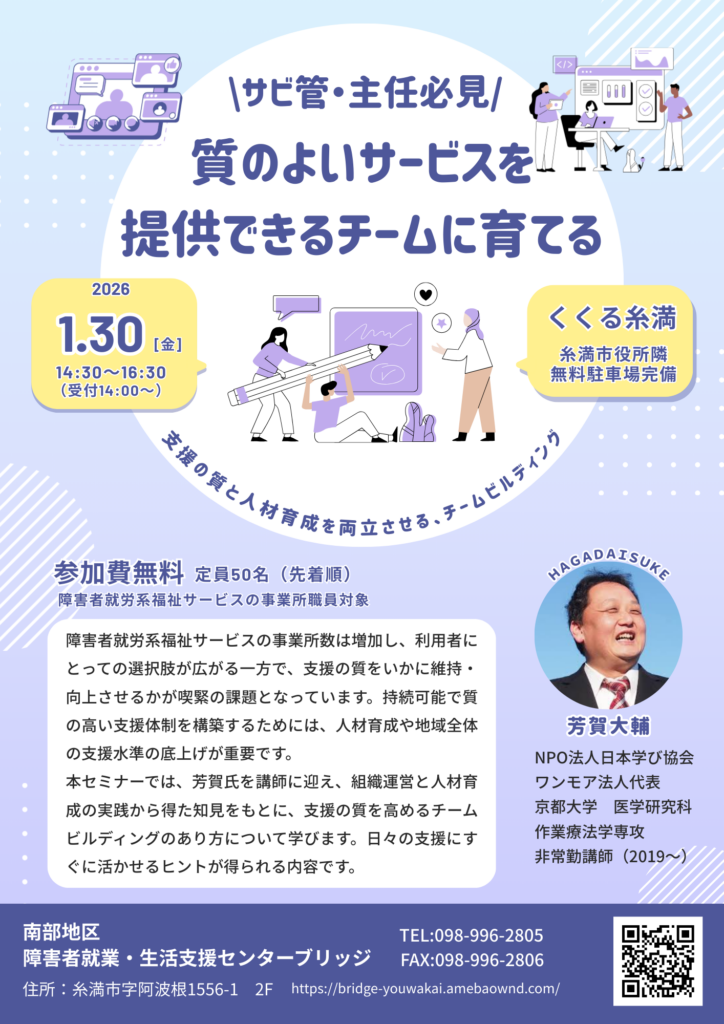 今回のブリッジセミナーは、「質のよいサービスを提供できるチームに育てる」をテーマに開催いたします。